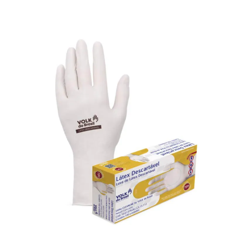 Luva de segurança confeccionada em borracha natural, com pó bioabsorvível, ambidestra e superfície lisa.